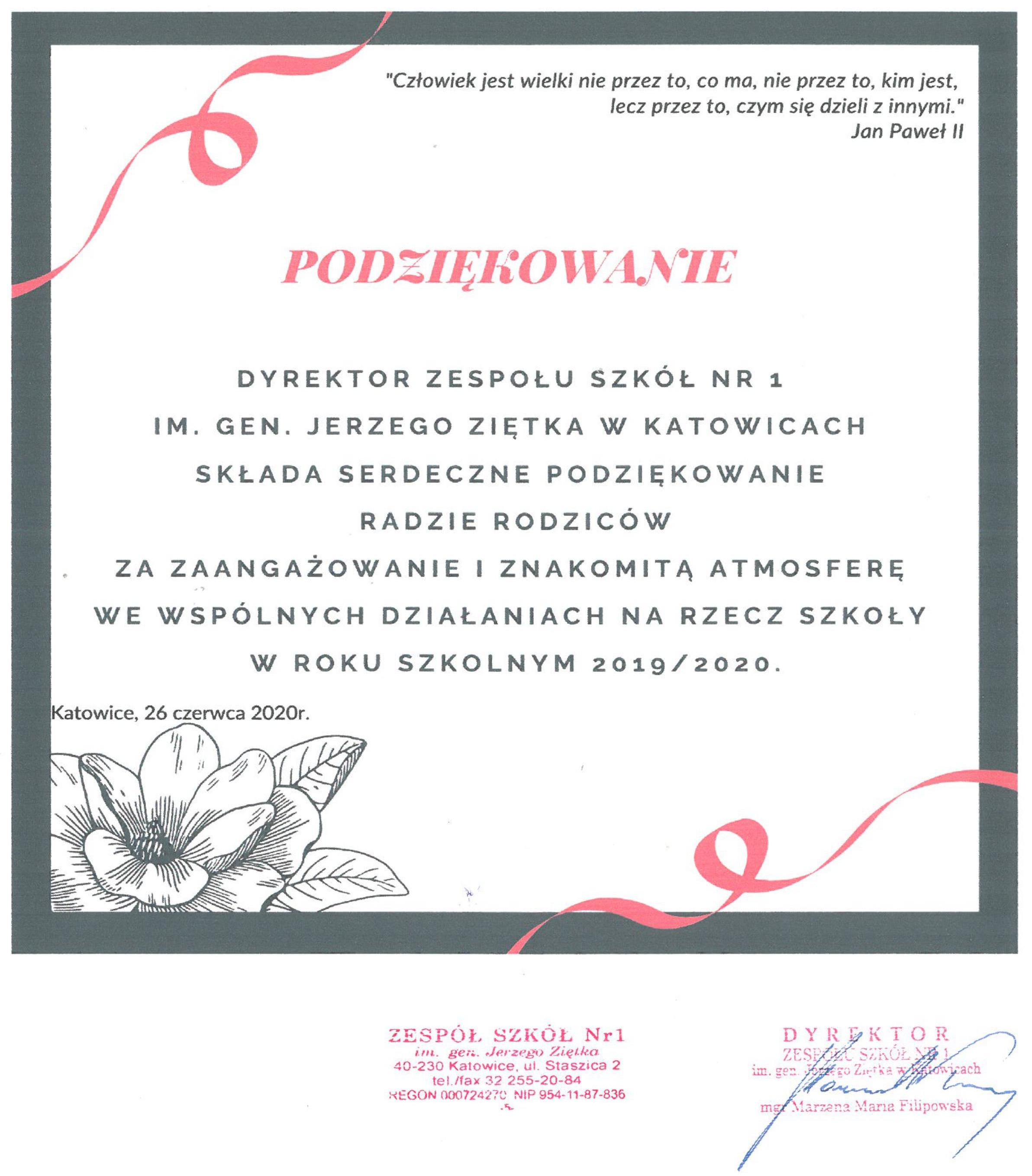 Podziekowanie dla Rady Rodzicow