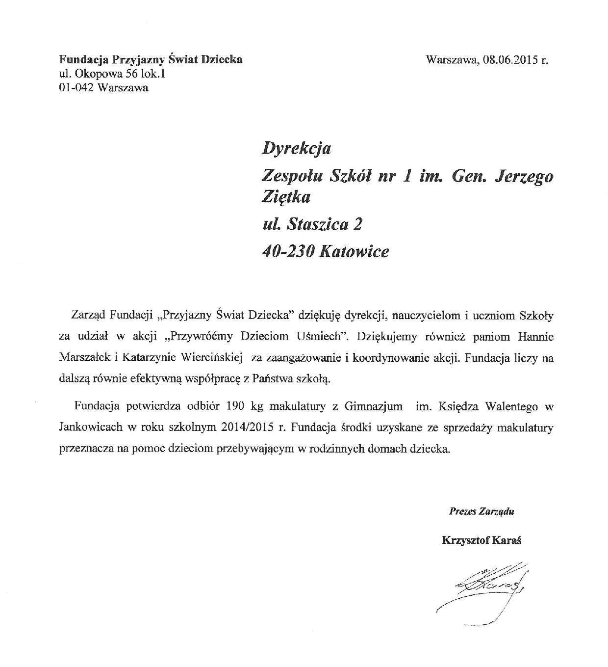 Przywróćmy dzieciom uśmiech - podziękowania dla szkoły
